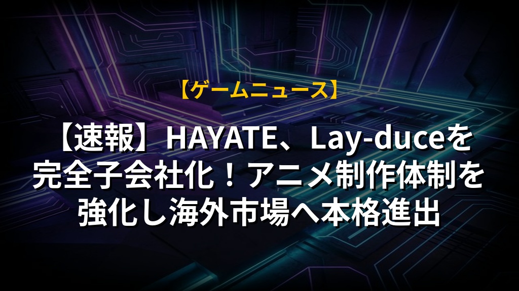 HAYATEがアニメ制作スタジオLay-duceを完全子会社化しました。グローバル市場を視野に入れた動きで、安定的なアニメ制作体制の構築が目的のようです。Lay-duceは海外評価も高く、今後の作品に期待が高まりますね。