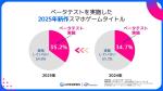 ベータテストの実施率は高止まりしており、これはスマートフォンゲーム市場において、リリース前のユーザー検証が不可欠な要素として定着したことを示唆しています。