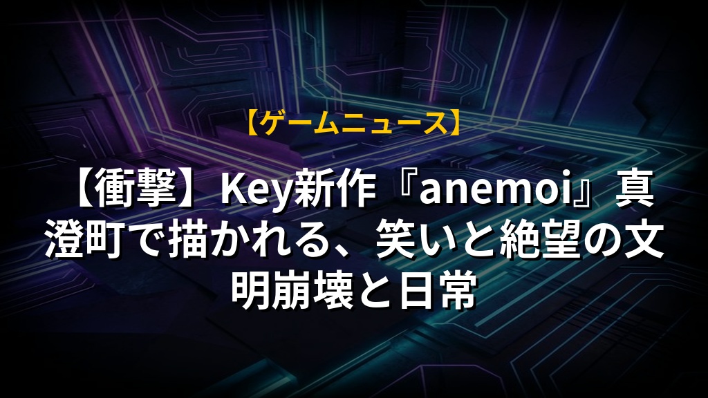 Key最新作『anemoi』の情報が公開され、笑いと伏線が魅力的な物語に期待が高まりますね。文明崩壊後の世界を舞台に、個性豊かな住民たちとの交流を通して、失われたものや人々の強さが描かれるようです。特にメインヒロインたちの“不思議さ”が気になるポイント。妹との関係性も物語の鍵を握っていそうですね。発売までまだまだ時間はありますが、温かい日常と切なさを織り交ぜた、Keyならではの作品になりそうです。