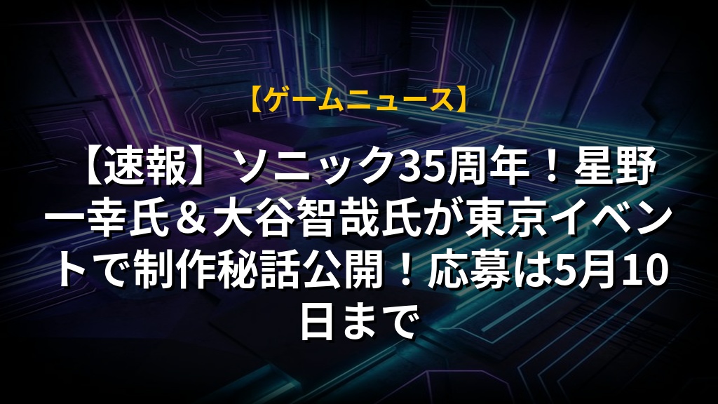 ソニック35周年を記念したファンミーティングツアーin東京が2026年6月21日に開催決定!星野一幸氏、大谷智哉氏をお迎えし、シリーズの歴史や制作秘話が語られるトークセッションは、長年のファンにはたまらない内容になりそうですね。参加は無料ですが、応募・抽選制なので、ぜひ応募してみてください。開発チームとの交流を通じて、ソニックの未来を感じられるイベントとなりそうです。