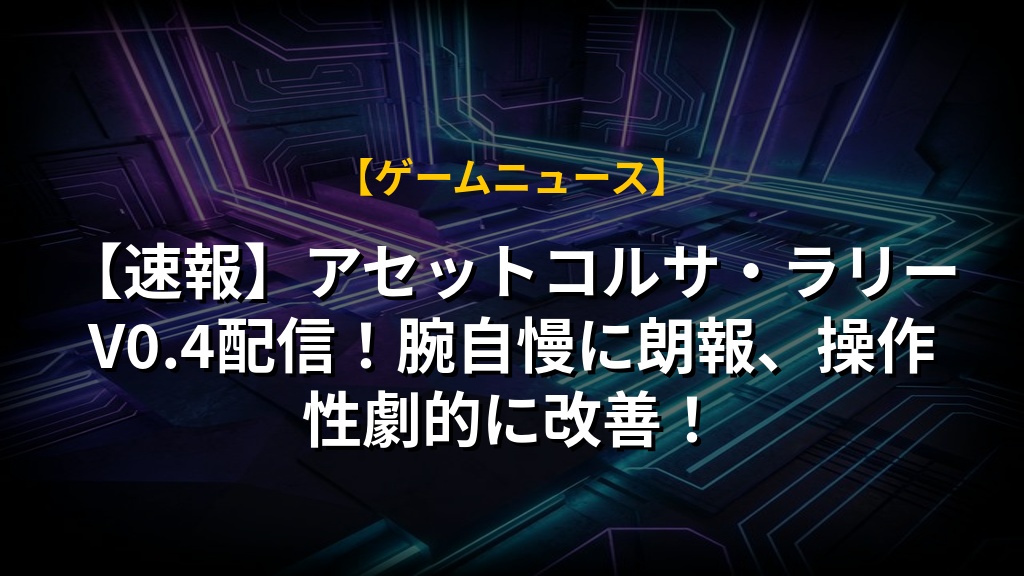 「アセット・コルサ・ラリー」大型アップデートV0.4が配信開始となりましたね!新たな車両やイベントに加え、WRCドライバーのアームストロング選手とのコラボによるマシン挙動の改善は、ドライビングの奥深さをさらに追求していると感じます。FWD/RWD/4WD設定の実装も、戦略の幅が広がって嬉しいポイントです。
